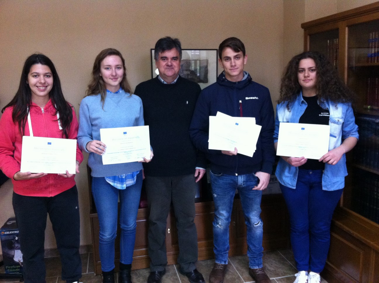 Ο νέος διευθυντής του σχολείου μας κ. Κατσάρος Φώτιος απένειμε τους τίτλους στους μαθητές που έλαβαν μέρος στο διαγωνισμό Juvenes Translatores 2016. Τους ευχαρίστησε για την προσπάθειά τους κι ευχήθηκε οι μελλοντικές δοκιμασίες τους να στέφονται πάντα με επιτυχία με πρώτη και βασική τη συμμετοχή τους στις Πανελλήνιες εξετάσεις.