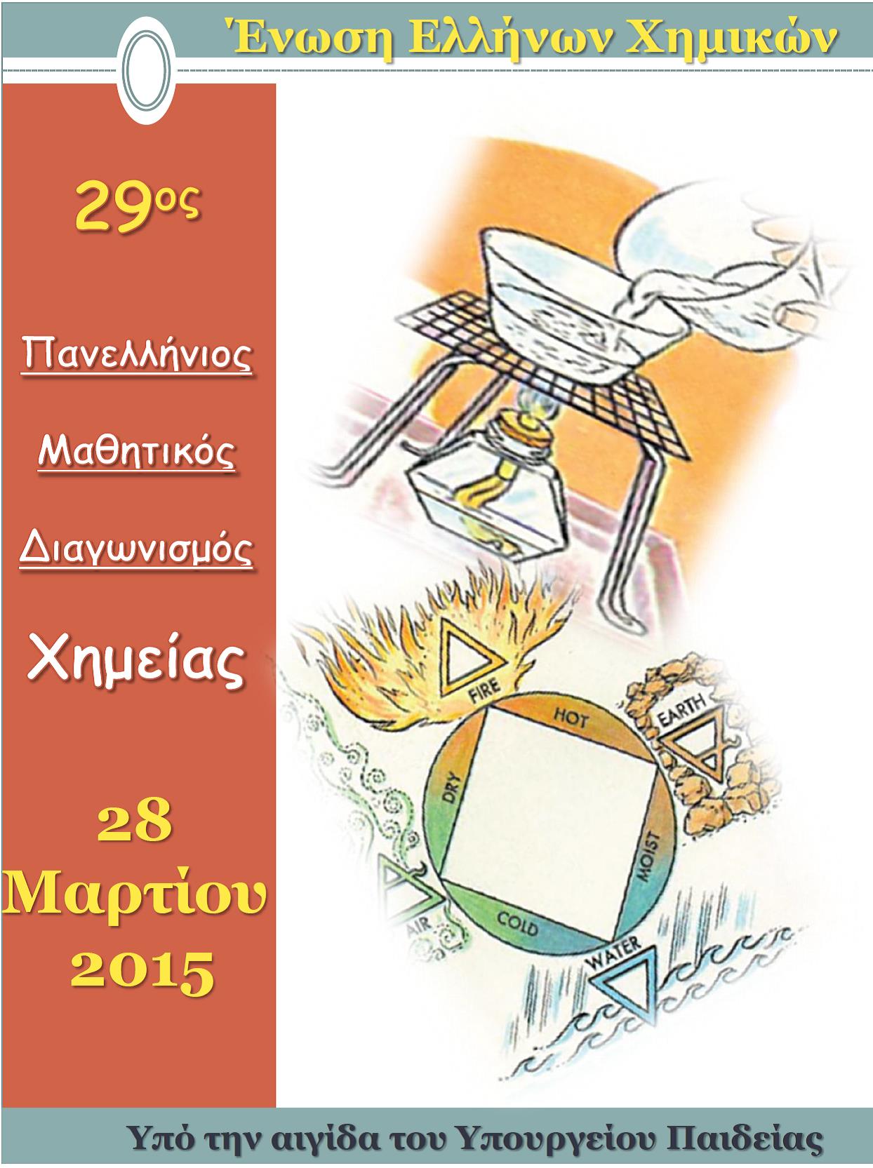Η Ένωση Ελλήνων Χημικών (Ε.Ε.Χ.) προκηρύσσει τον 29ο Πανελλήνιο Μαθητικό Διαγωνισμό Χημείας (Π.Μ.Δ.Χ.) στις 28 Μαρτίου 2015, ημέρα Σάββατο (ώρα 8.30 π.μ.).